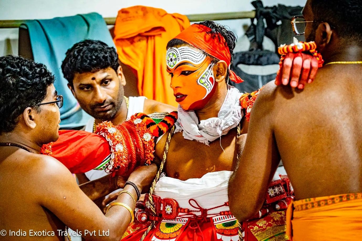 Hours before the ritual begins, the artist patiently applies intricate face paint — bold reds, deep blacks, radiant yellows — each line drawn with symbolic precision. Towering headgear and elaborate costumes follow, transforming the human form into something extraordinary. Then comes the most arresting moment: the dancer gazes into a mirror. In that sacred instant, it is believed that the divine presence descends. The performer is no longer simply an individual — he becomes the embodiment of the deity.